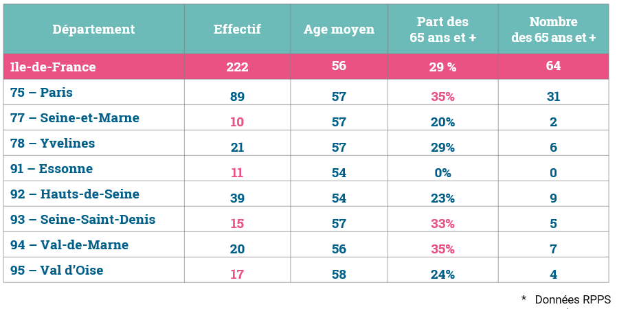 222 endocrinologues exercent en cabinet en Ile-de-France dont les ¾ sont des femmes. L’âge moyen est de 56 ans.